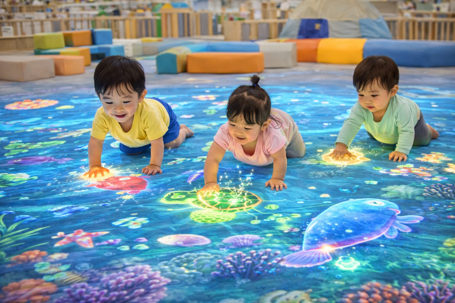床いっぱいに広がる海の映像の中で、赤ちゃんが自由に『はじめての冒険!!』。